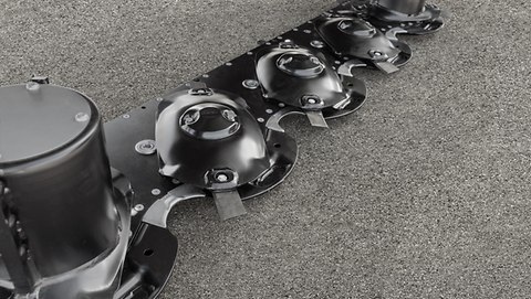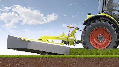 Lorsqu'une unité de fauche s'approche d'un obstacle, la protection contre la surcharge intervient et la machine peut pivoter vers l'arrière. Il suffit d'une brève marche arrière pour repartir. Le bord extérieur de la faucheuse est en outre protégé des dégradations par un arceau supplémentaire.