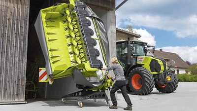 Le support de remisage pratique est disponible en option avec ou sans roues. Après le travail, la faucheuse se replie en position de transport. Le support de rangement à roues permet de la remiser dans les endroits exigus et de la manœuvrer facilement sans tracteur.