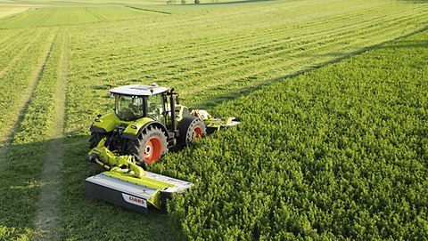 La faucheuse est entraînée par des arbres à cardan requérant une maintenance minime. La robuste transmission par courroie minimise les pics de charge et peut être tendue sans outil via un bouton rotatif. La force est alors transmise via un réducteur double qui assure l'entraînement à l'entrée du lamier, juste au-dessus du premier disque de coupe – un sabot intérieur n'est pas nécessaire et le flux de fourrage est optimal.