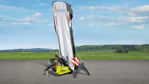 Grâce à son système de repliage télescopique inédit, la faucheuse se replie à 120° en position de transport, comme les autres modèles CONTOUR. De plus, grâce à un vérin combiné à la sécurité anticollision non-stop hydraulique, la DISCO 4400 CONTOUR est basculée vers l'arrière. Parallèlement, la toile de protection (option) est repliée automatiquement de 180°.