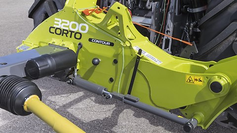 Les unités de fauche de la gamme CONTOUR oscillent librement autour de leur articulation centrale et épousent parfaitement le profil du sol. L'indicateur de position (flèche de contrôle) bien visible indique la hauteur idéale.