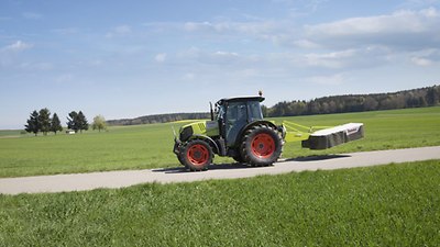 La position de transport à 120° et le centre de gravité proche du tracteur garantissent une grande stabilité et une faible hauteur pour les déplacements. Comme elle est inclinée, la faucheuse laisse la vue dégagée dans les rétroviseurs extérieurs. La répartition équilibrée des charges sur l'essieu arrière permet un déplacement sans secousses ni vibrations. Vous pouvez ainsi circuler et manœuvrer sur la route en toute sécurité.