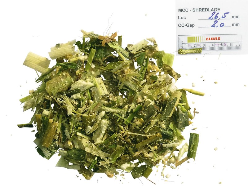 Le SHREDLAGE® est un concept de fourrage encore relativement récent inventé en Amérique du Nord. Le fourrage peut être ensilé avec une longueur extrême pouvant aller jusqu'à 30 mm. Grâce à un éclatement très important des grains et à un broyage intégral des rafles, la quantité d'amidon disponible dans la panse des vaches – et donc la valeur énergétique du fourrage – augmente. En outre, les tiges sont parfaitement broyées dans le sens de la longueur, avec pour objectif d'obtenir un fourrage à structure riche et d'améliorer ainsi la rumination.