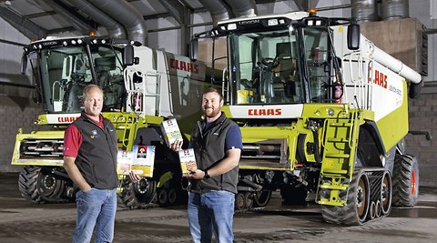 Robert et Ed Salmon, Comté de Norfolk, Grande-Bretagne Surface exploitée : 1 964 ha Cultures : blé d'hiver (649 ha), orge d'hiver (209 ha), orge d'été (99 ha), haricots verts (270 ha), multiplication de semences (46 ha), graines de lin (153 ha), colza (361 ha), maïs d'ensilage (42 ha), seigle fourrager (9 ha), seigle brassicole (39 ha), betteraves à sucre (30 ha), pommes de terre et oignons (58 ha) Sols : sols principalement argileux, sols partiellement sablonneux et légers Effectif : Robert et Ed Salmon, quatre employés, plusieurs saisonniers en période de récolte Moissonneuse-batteuse actuellement utilisée : LEXION 780 TERRA TRAC