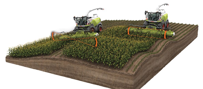 Le profil du terrain importe peu pour la récolte du maïs avec l'ORBIS. L'adaptation optimale au profil du sol est assurée par le nouveau cadre oscillant associé au système de régulation perfectionné CONTOUR / AUTO CONTOUR. Lorsque les patins sont entièrement en contact avec le sol, la régulation AUTO CONTOUR bascule automatiquement en position flottante. La régulation de la pression d'appui au sol permet ainsi une excellente compensation transversale.